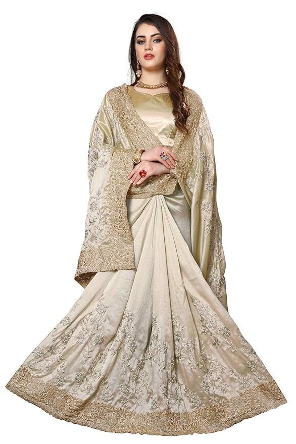 Beige Mayo Silk Zari Resham Stone Embroidery Work Saree with Blouse Piece