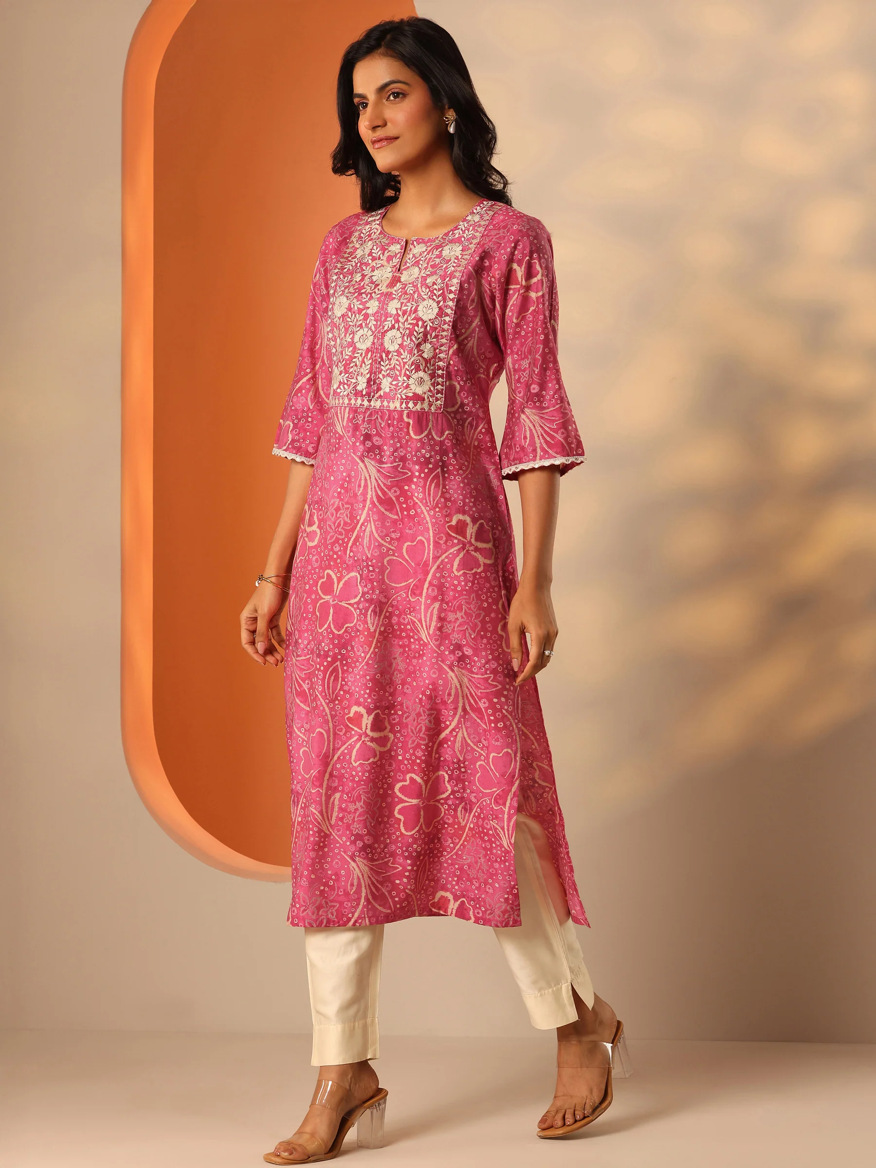Pink Printed Silk Blend Straight Kurta