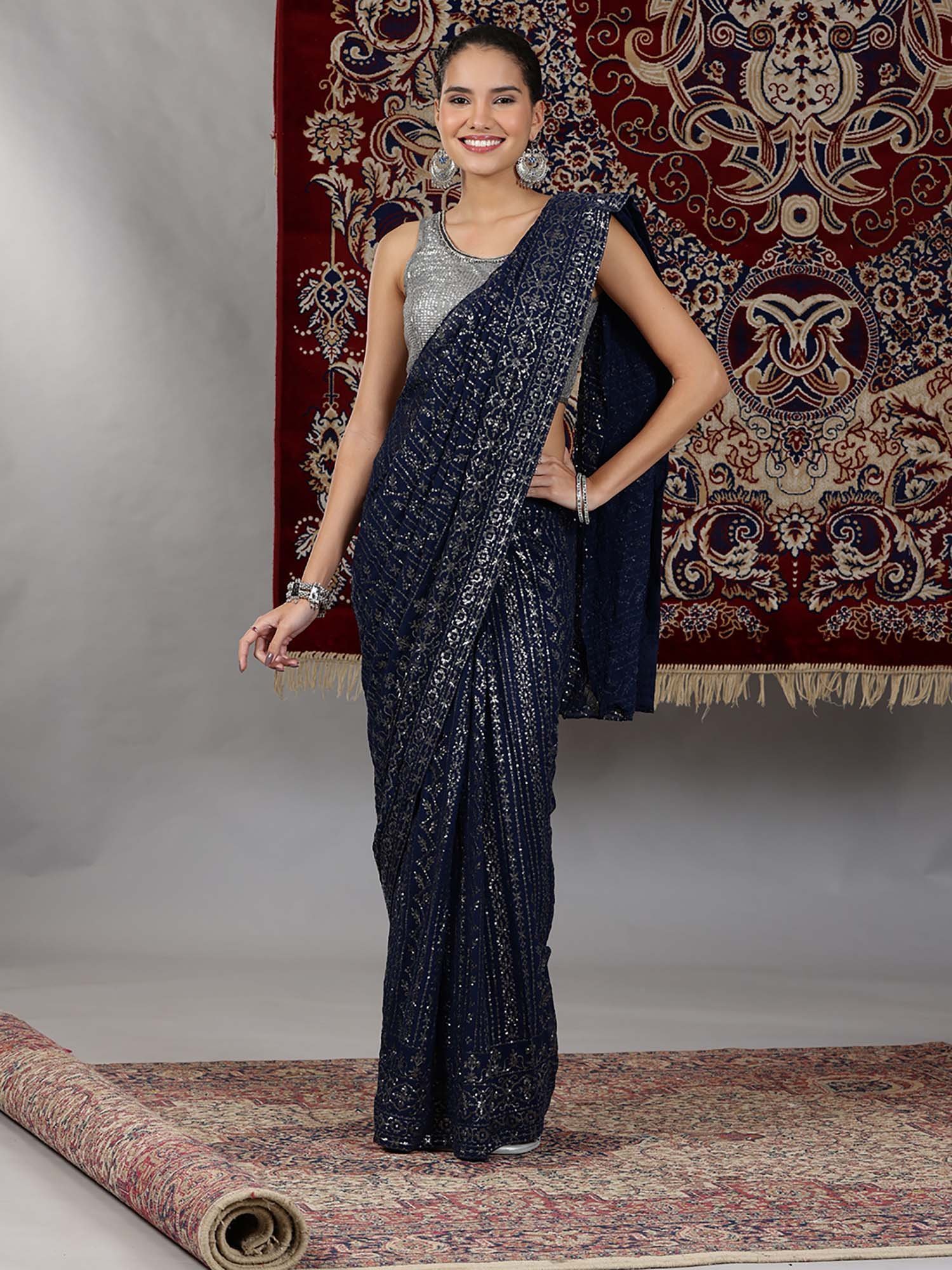 Silver and Blue Sequin Embellished Crop Top and Pre-Stitched Saree (Set of 2)