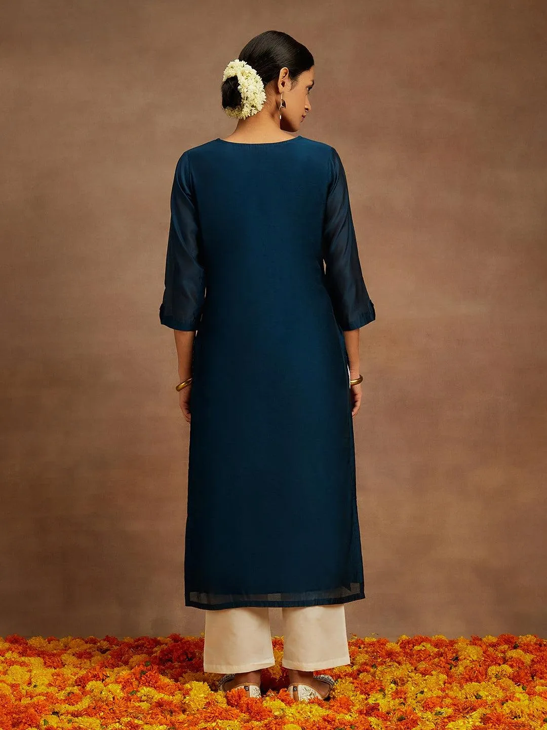 Teal Embroidered Chanderi Silk Straight Kurta
